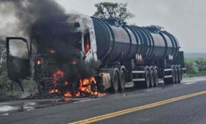 Um caminhão-tanque carregado com biodiesel foi incendiado e atingido por disparos de arma de fogo nessa segunda-feira (3/11), no km 625,8 da BR-262, em Ibiá (MG),