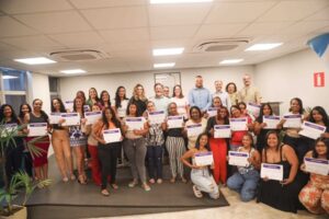 Turma de formandas do Facilita Trabalho com autoridades na solenidade de formatura Na manhã desta quinta-feira (10), 45 mulheres do Programa Facilita Trabalho receberam o