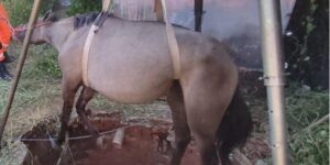 Uma égua caiu em uma fossa com mais de 3 metros de profundidade em São Francisco, no Norte de Minas. O Corpo de Bombeiros foi