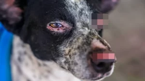 Com os olhos queimados e o focinho ainda em pele viva, Branquelo, um cachorro vira-lata, se recupera de um susto. Os machucados são do dia da queda