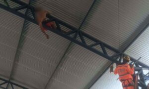 Um jovem de 23 anos precisou ser resgatado pelo Corpo de Bombeiros Militar de Minas Gerais (CBMMG) depois de ficar preso no topo do teto