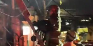 Nove cães foram resgatados na laje de um depósito de material de construção que estava tomado por um incêndio de grandes proporções no bairro Santo