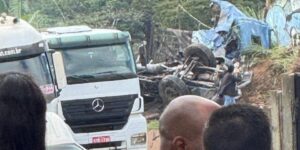 Pai e filho, de 50 e 30 anos, ficaram feridos após um caminhão que transportava leite tombar no Anel Rodoviário, próximo ao pátio de apreensões