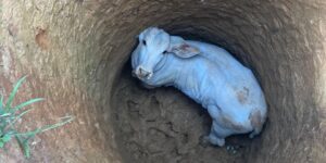 Um bezerro precisou ser resgatado pelo Corpo de Bombeiros após cair em um buraco com cinco metros de profundidade e um metro de largura em