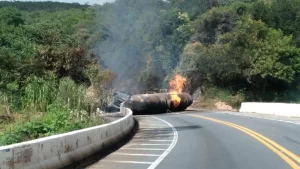 Uma carreta carregada com etanol tombou e pegou fogo na altura do quilômetro 349 da BR-251 em Fruta de Leite, no Norte de Minas, na