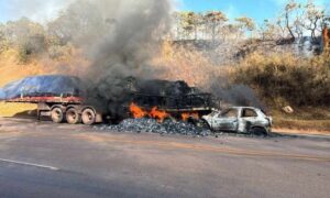 Um acidente entre carro e caminhão deixou quatro pessoas feridas, causou um incêndio e fechou a BR-040, em Itabirito, na Região Metropolitana de Belo Horizonte,