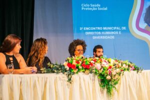 Composição de mesa para diálogo sobre Direitos humanos e diversidade Nessa última quarta-feira (11), o teatro da Fundação Cultural Carlos Drummond de Andrade (FCCDA) foi