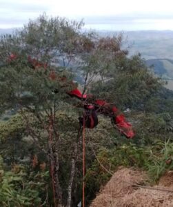 Dois homens, de 28 e 41 anos, ficaram presos na copa de uma árvore após decolagem de parapente no distrito de Pirapanema, em Muriaé, na tarde