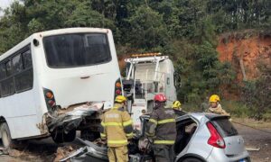 O trânsito na BR-040, na altura do quilômetro 658, em Carandaí, na Região Central de Minas Gerais, está parcialmente interditado na manhã deste sábado (24/5). No local,