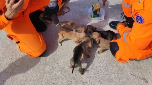 O Corpo de Bombeiros resgatou na manhã deste sábado (24) cinco filhotes de cachorro. Os animais estavam em um córrego no bairro Nova Contagem, em