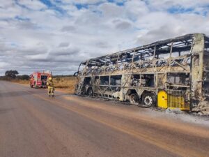 Um ônibus de excursão ficou destruído na manhã deste domingo (13/7) após incêndio na rodovia MG-188, em Unaí, no Noroeste mineiro. Segundo o Corpo de