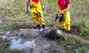 Um cavalo que ficou atolado em um buraco cheio de barro e água foi resgatado pelo Corpo de Bombeiros em Alfenas, no Sul de Minas