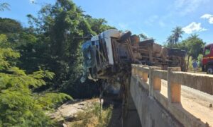 Um jovem de 23 anos ficou ferido após a carreta que dirigia tombar em uma ponte da BR-146, zona rural de Araxá, na Região do Triângulo, na