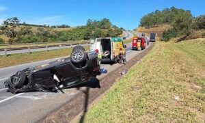 Um carro invadiu a pista contrária, bateu em um caminhão na BR-381 e capotou pouco depois do trevo que dá acesso à cidade de Oliveira,