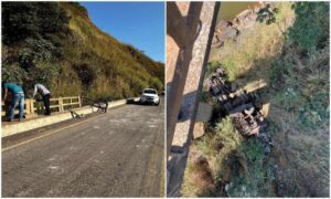 O motorista de um caminhão morreu esmagado depois de o veículo que ele conduzia despencar de uma ponte na BR-262, em São Domingos do Prata,