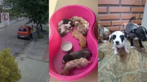 Imagens de câmeras de monitoramento registraram o momento em que uma mulher abandona sete filhotes de cachorro em frente a uma casa no bairro Castelo,