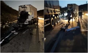 Um engavetamento envolvendo três veículos de carga deixou duas pessoas mortas no início da noite desta terça-feira (7/10) na BR-381. O acidente aconteceu na altura