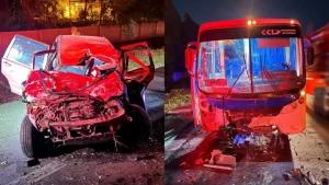 Uma pessoa morreu após uma batida frontal entre um ônibus e um carro de passeio, na madrugada deste sábado (4), no Km 468 da BR-040,