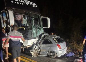 Cinco pessoas que estavam em um carro de passeio morreram após uma batida contra um ônibus com romeiros na MGC-122, em Janaúba (MG), no Norte