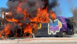 São João Evangelista (MG) – Um incêndio destruiu, na manhã deste sábado (26), o ônibus da banda Bonde do Forró, na BR-120, na altura do