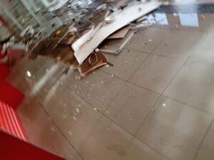 A agência do banco Santander, na rua Tiradentes, Centro, em Itabira, foi interditada pela Defesa Civil neste domingo (14) após o desabamento de parte do forro de gesso do teto na área de caixas automáticos, que causou danos na rede elétrica e nos dutos do sistema de ar condicionado. O incidente ocorreu durante as chuvas intensas durante a madrugada. Ainda não há previsão de quando a área será liberada.
