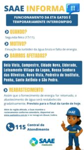 Na manhã de hoje, o funcionamento da ETA foi novamente interrompido, desta vez por falta de energia elétrica. A Companhia Energética de Minas Gerais (Cemig) já foi acionada e informou que o restabelecimento da energia está previsto até o final da tarde desta segunda-feira (17/11). Assim que o fornecimento for retomado, o abastecimento de água será restabelecido gradativamente.