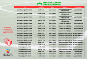 Ao todo, são seis núcleos espalhados pelos campos dos bairros São Marcos, Gabiroba, Santa Ruth, Fênix e Pedreira. A expectativa é de que até o final do ano o projeto contemple oito núcleos para 950 crianças e adolescentes no total. Para se inscrever nas aulas, basta comparecer aos locais abaixo, de acordo com os horários em anexo.