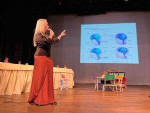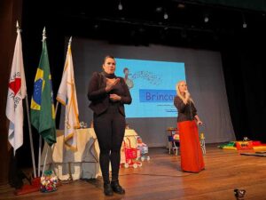 A palestrante, Cláudia Bragança, que é psicóloga, pedagoga e especialista em neurociência e psicologia positiva, fez uma apresentação especial, explicando o desenvolvimento da criança desde a gestação até os primeiros anos de vida, mostrando como o brincar traz benefícios para as crianças. “Enquanto estão brincando as crianças vão experimentando as vivências de disputar, construir a dimensão do outro, nutrindo a empatia e construindo também a autoconfiança enquanto ser. E hoje a neurociência nos mostra, de forma muito clara, o que acontece no cérebro da criança enquanto brinca. Ajuda na liberação de serotonina e outras substâncias que auxiliam no controle de ansiedade, favorece a concentração e aprendizagem, ativa a motivação do sistema de prazer e vários outros benefícios”, afirma Cláudia Bragança.