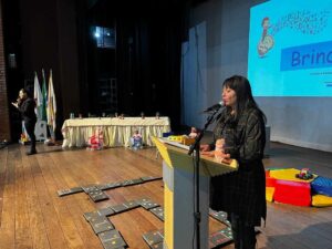A palestrante, Cláudia Bragança, que é psicóloga, pedagoga e especialista em neurociência e psicologia positiva, fez uma apresentação especial, explicando o desenvolvimento da criança desde a gestação até os primeiros anos de vida, mostrando como o brincar traz benefícios para as crianças. “Enquanto estão brincando as crianças vão experimentando as vivências de disputar, construir a dimensão do outro, nutrindo a empatia e construindo também a autoconfiança enquanto ser. E hoje a neurociência nos mostra, de forma muito clara, o que acontece no cérebro da criança enquanto brinca. Ajuda na liberação de serotonina e outras substâncias que auxiliam no controle de ansiedade, favorece a concentração e aprendizagem, ativa a motivação do sistema de prazer e vários outros benefícios”, afirma Cláudia Bragança.