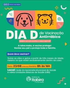Itabira promove no próximo sábado (23), o primeiro Dia D de Vacinação Antirrábica para cães e gatos de 2025. A ação acontecerá das 8h às 16h, na sede da Secretaria Municipal de Saúde (SMS) e em mais 27 pontos estratégicos espalhados pela cidade.