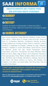 O Serviço Autônomo de Água e Esgoto (SAAE) de Itabira informa que, devido à queda do nível da Estação de Tratamento de Água (ETA) Pureza, o abastecimento em diversos bairros da cidade pode ser afetado neste domingo (23). O volume de produção da ETA voltou a cair neste final de semana, devido à ausência de chuvas constantes e de uma manutenção corretiva que impacta na captação de reforço.